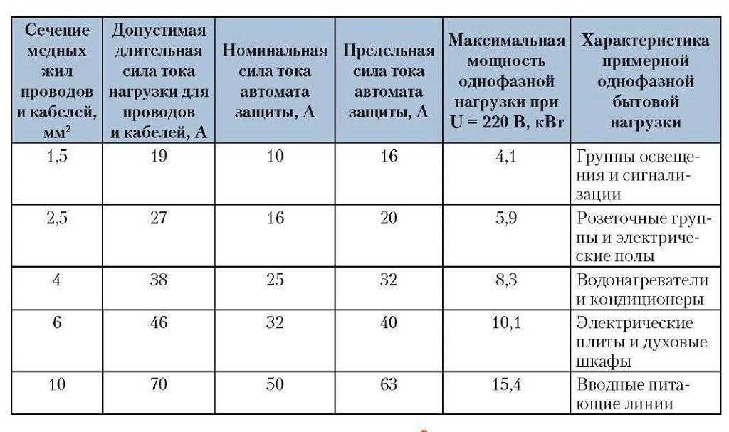 Для правильного выбора сечения проводов, а также номинальных параметров защитных устройств можно воспользоваться такими рекомендациями: