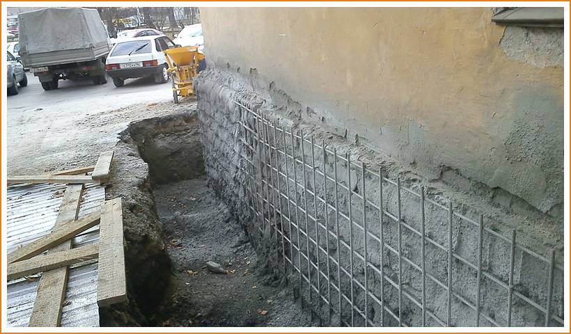 При таком способе ремонта нет необходимости поднимать здание. Работы выполняются по стандартной схеме: вдоль старого фундамента роются траншеи соответствующей глубины.