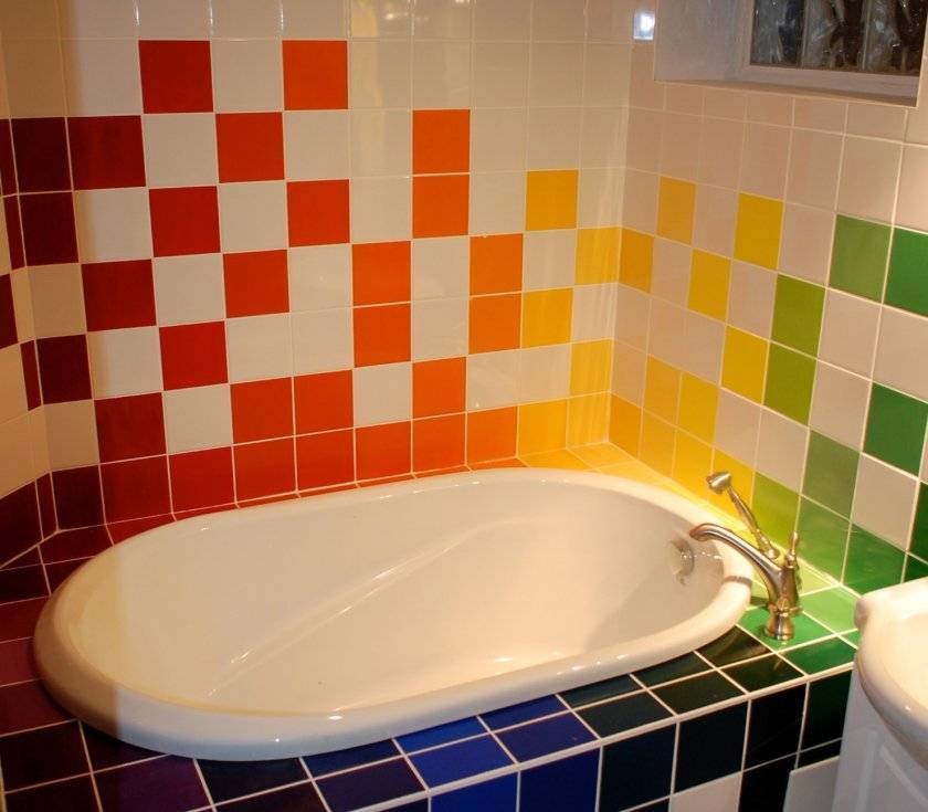 Благодаря рисунку «под кафель» комната выглядит ничуть не хуже, чем отделанная настоящей керамикой. Можно добавить яркие акценты либо объемные рисунки для подчеркивания индивидуальности.