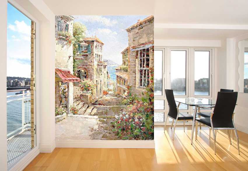 Небольшие рисунки с эффектом прорыва пространства стали излюбленным декором в стиле модерн. В просторных помещениях используются более масштабные природные или городские пейзажи.