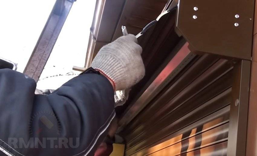 После этого остаётся только завершить монтаж. Проводится установка заглушек на шины, крепится на заклёпках крышка короба, прикручиваются ручки-ограничители. После окончательной сборки роллеты нужно по нескольку раз поднять и опустить, фиксируя в разных положениях, проверить наличие трений в направляющих, посторонних шумов и заеданий в приводном механизме.