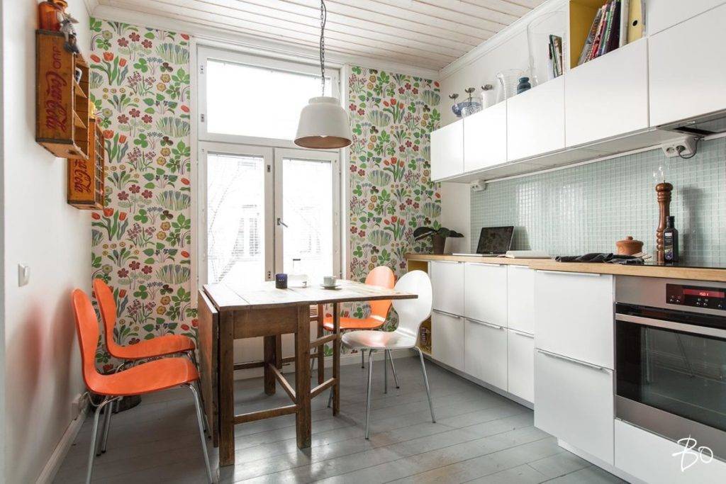 - Для отделки стен можно использовать кафель или моющиеся обои. В последнее время обеденная зона кухни все чаще покрывается краской — так можно создать прочное, водостойкое и эстетически привлекательное покрытие.