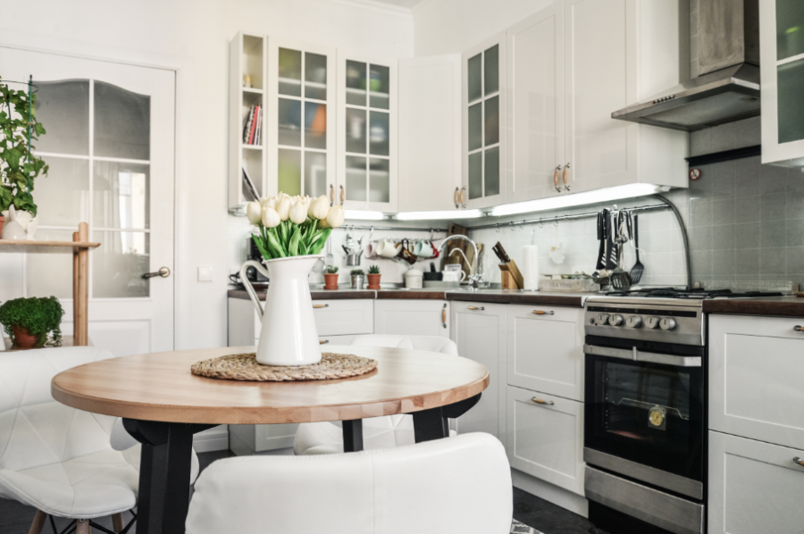 Для маленькой кухни подойдет Г-образная, П-образная, однорядная планировка. Визуально раздвинуть стены и добавить больше света позволит выбор светлых цветов в интерьере, использование зеркальных поверхностей. Также сэкономит место встроенная техника, функциональная мебель, сделанная на заказ, раскладная обеденная группа, ролеты на окнах.