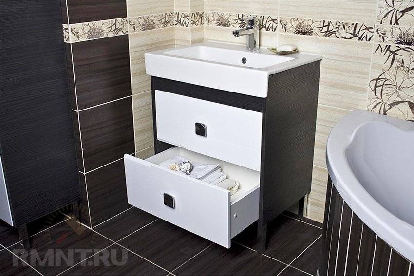 встраиваемая раковина. Этот вариант является наиболее классическим (а для большинства людей еще и единственным), предполагая размещение раковины по всей поверхности (или по большей части) тумбы, в которой для этого подготовлено углубление нужных размеров. Неудобство этого варианта заключается в необходимости герметизировать стыки и швы, поскольку вероятность попадания влаги в шкафчик велика;