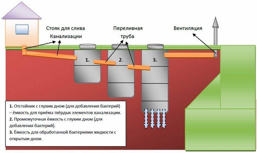 Схема 3-камерного септика с дренажным полем