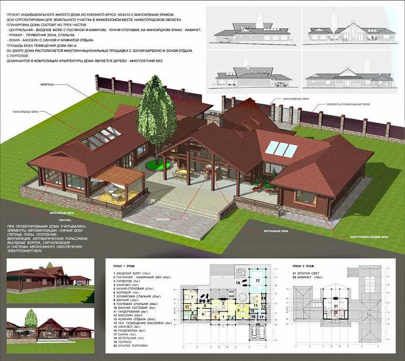 Для первого этажа обычный комплект помещений: тамбур, прихожая, коридор, санузел, кухня, при наличии второго этажа или мансарды – лестница, при отсутствии отдельного помещения – бойлерная и котельная. Возможно спланировать гостевое помещение, кабинет, а также комнаты для стирки, размещения гардероба, хранения вещей или продуктов и ещё ряд помещений специального назначения. Можно предусмотреть устройство веранды или террасы.