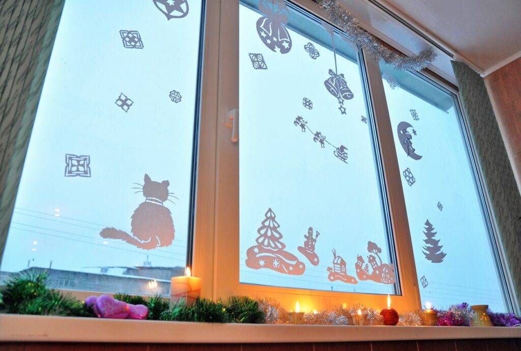 Сделать наклейки можно самостоятельно, вырезав фигурки из плотной бумаги. Чем больше мелких деталей, тем сложнее работа и тем эффектнее результат. Крепить готовые украшения на окно лучше с помощью густого и насыщенного мыльного раствора. Двусторонний скотч оставляет некрасивые следы на стекле.