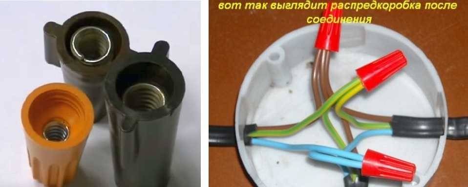 Если надо монтировать мощный потребитель электроэнергии, допускается применение колпачков и длинных скруток, сформированных с их помощью. Как это делается, показано далее на изображениях.