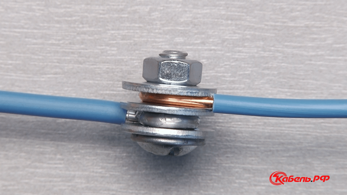 Для проводки большого диаметра можно применить резьбовое соединение. Для этого потребуется винт, гайки и пружинные шайбы. Кабель зачищается на расстояние, равное длине окружности соединительного элемента. Затем устанавливается пружинная шайба и одна опорная гайка. Жила обматывается вокруг винта и снова устанавливается шайба.