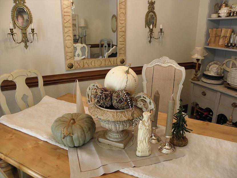Группа предметов в одной тематике, помещённая в центре стола, служит испытанным способом украшения. Сделать интерьер кухни более интересным помогут разномастные бутылочки, вазы и статуэтки, необычные подсвечники, живые цветы и даже овощи. Важная деталь: вещи размещаются в точно выверенном искусственном беспорядке.