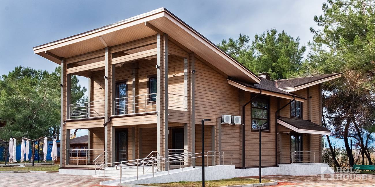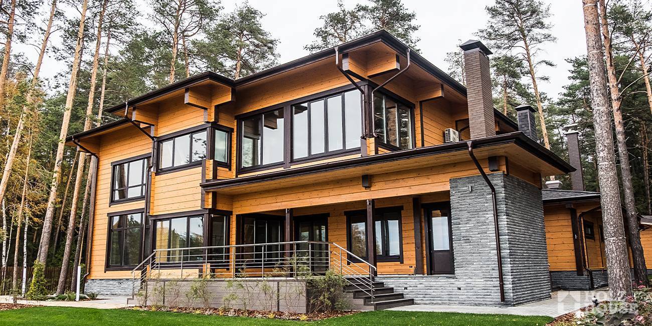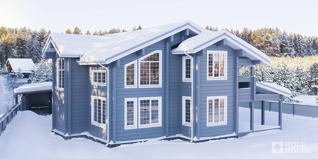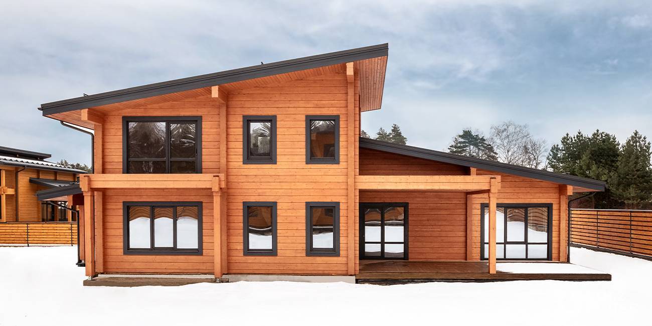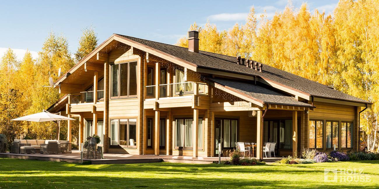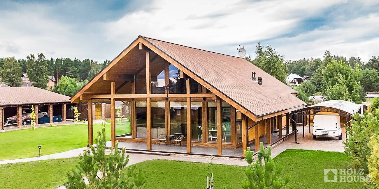 В основе фахверкового дома из клееного бруса – жесткий деревянный каркас, который остается виден снаружи. Фахверковые дома долговечны и практичны, отличаются высокой скоростью возведения и удобны в эксплуатации. Для создания контраста наружные балки каркаса, как правило, красят в темные цвета, а стены оставляют светлыми. В современных домах из клееного бруса в стиле фахверк популярно использование больших панорамных окон.