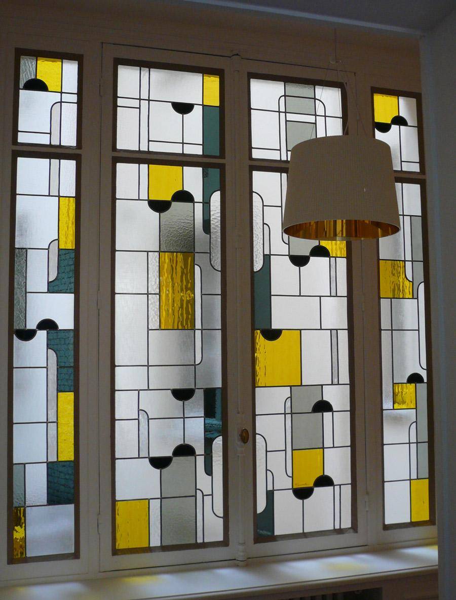 Кроме этого, витражную пленку можно применять как часть украшения интерьера. Если у вас имеются стеклянные поверхности, находящиеся внутри помещения, например, стекло межкомнатной двери, стеклянная дверца шкафа или поверхность журнального столика, пленку можно применить к ним. Часто такой прием используется для украшения межкомнатных дверей, окон, перегородок, используемых для разграничения пространства. Прием актуален в жилых помещениях, офисах, барах, музеях.