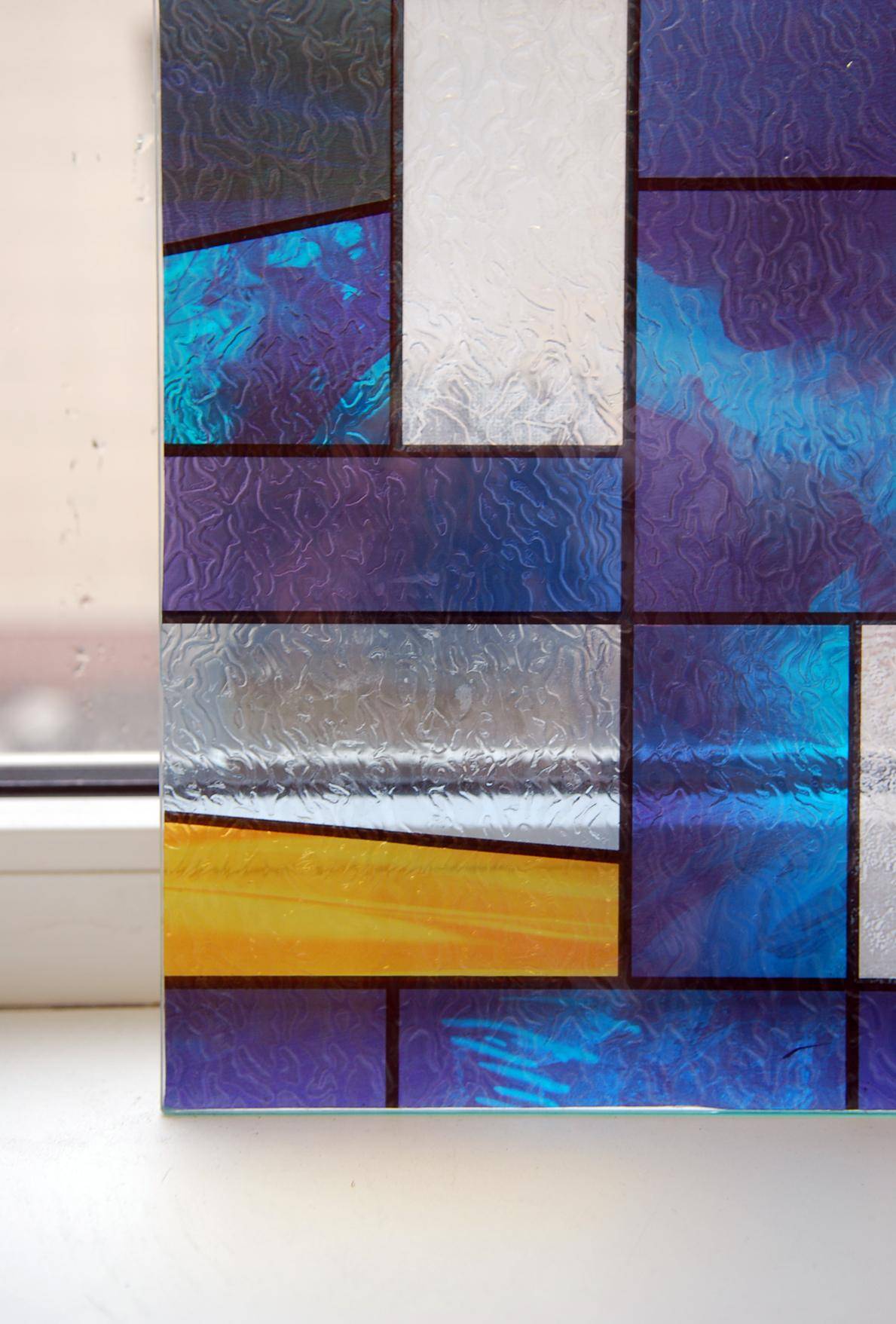 При изготовлении витражных стекол мы применяем классическую английскую технологию, когда цельный лист стекла расчерчивается с помощью оловянной протяжки, а потом декорируется полимерными пленками различных цветов и фактур. Используемая пленка отличается устойчивостью к ультрафиолету, поэтому со временем не выгорает, не теряет своей яркости.