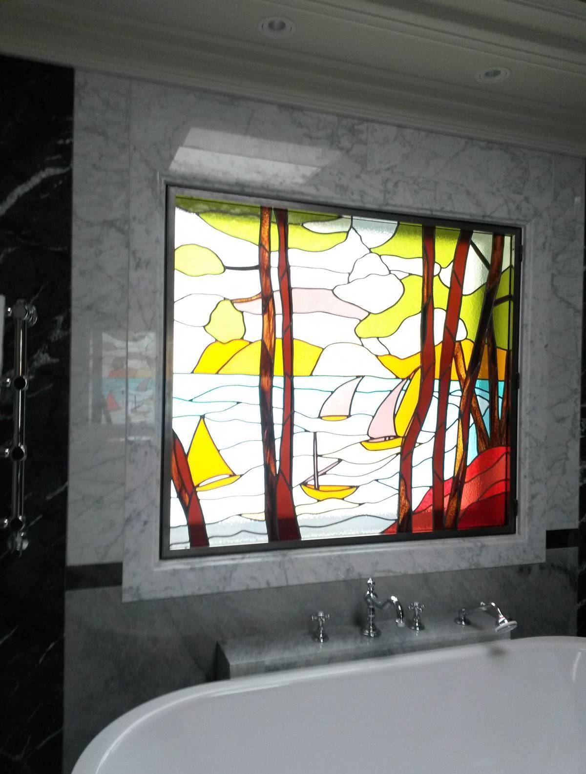 Благодаря тому, что прогресс позволяет изготавливать декоративное стекло на любой вкус и цвет, дизайнеры умудряются применять витражи в самых необычных местах.