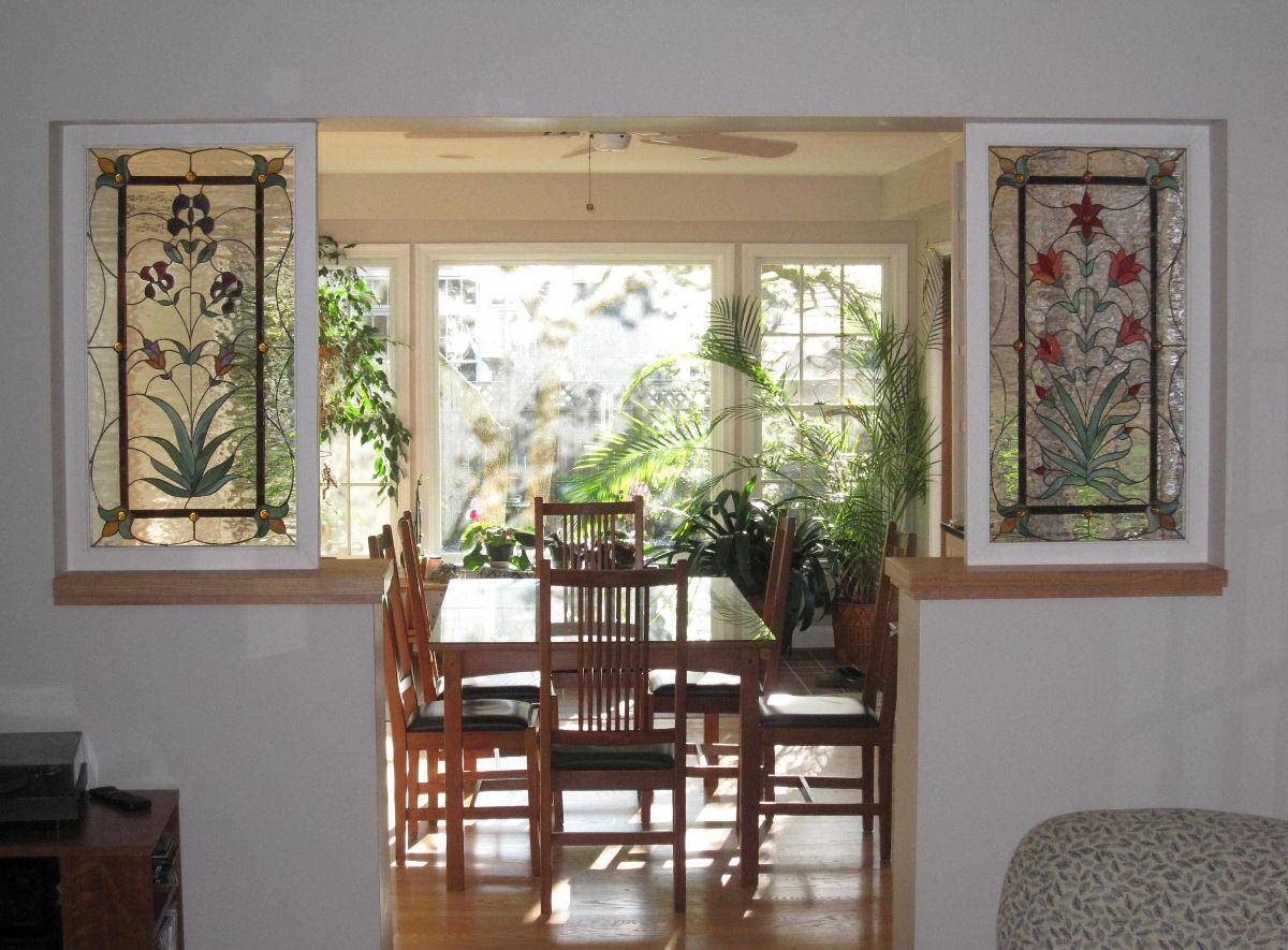 Декоративные перегородки между комнатами также могут быть декорированы витражной пленкой.