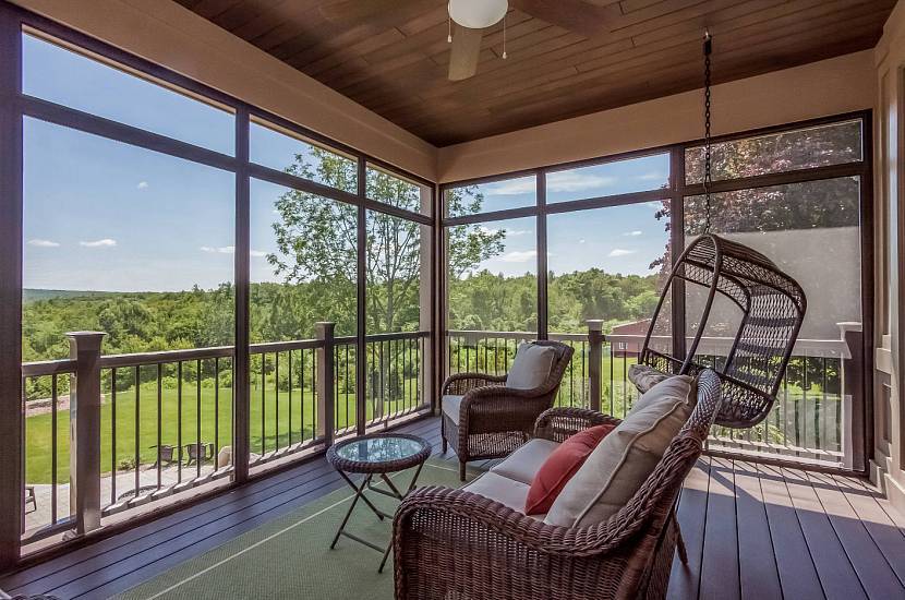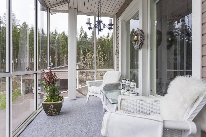 Обеденную зону в загородных домах принято устраивать на террасе или веранде. Балкон используют как место для отдыха, чаепития или просто созерцания красоты окружающего пейзажа и не загромождают мебелью. Здесь можно разместить компактный журнальный или чайный столик.