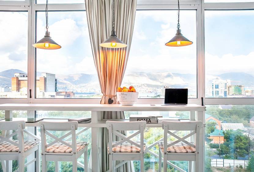 Приятно провести время за чашечкой кофе или бокалом коктейля дома за барной стойкой и любоваться уличным пейзажем, который открывают панорамные окна. Существует несколько вариантов, как разместить стойку. Наиболее популярный – со столешницей, придвинутой непосредственно близко к окну.