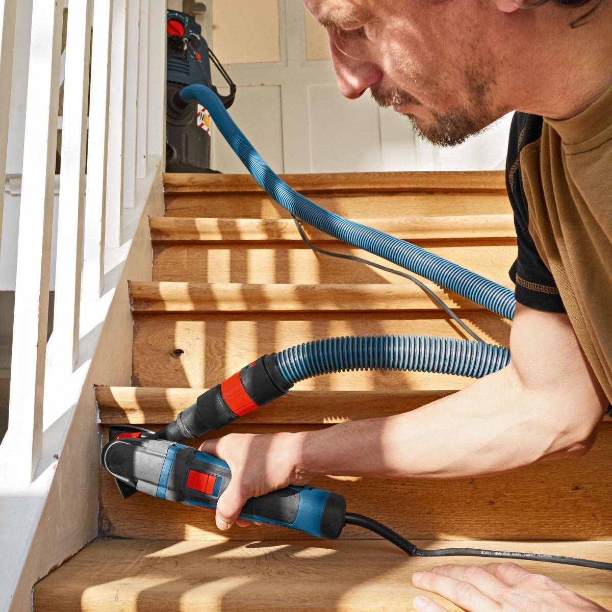 На первом месте немецкий реноватор от «Бош», обладающий мощностью 550 Вт и совершающий коллебания от 8000 до 20000 в минуту. Корпус МФИ покрыт во многих частях резиной, поэтому держать его удобно даже во вспотевших руках. При меняющейся нагрузке мультирезак держит постоянные обороты. Весит инструмент 1.6 кг. Узкий корпус можно оснастить дополнительной насадкой для подключения к пылесосу. По бокам предусмотрена перфорация для ускоренного охлаждения двигателя. Вместе с товаром поставляется вместительный кейс. Реноватор нравится покупателям в отзывах богатством комплектации с 35 насадками, среди которых есть: универсальный резак, погружное пильное полотно, сегментированный пильный диск, шлифовальная подошва.