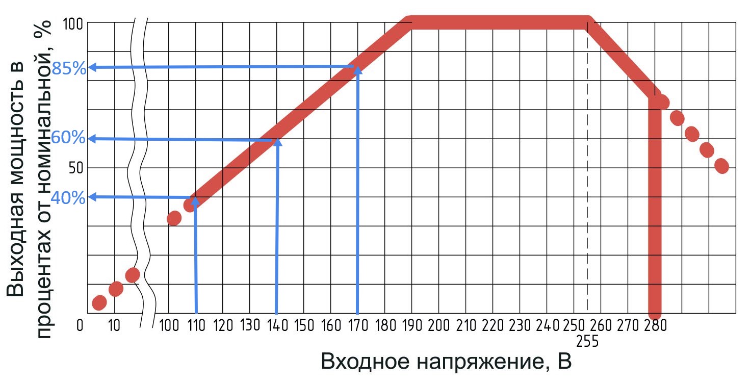 при падении до 140В вообще остается только 60% заявленной мощности: