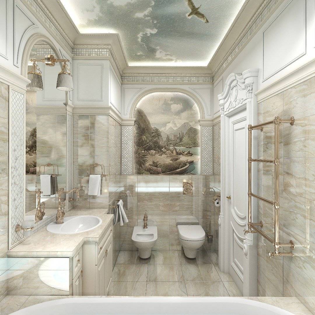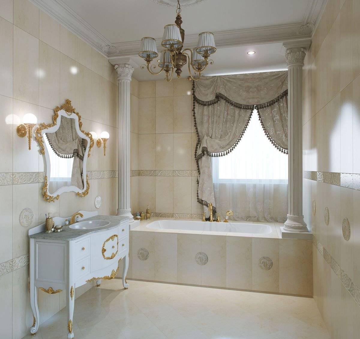 Зеркало в металлическом витиеватом багете, бра, маленькие золотые крючки, ванная на гнутых «бронзовых» ножках – несомненно, обозначат основные маркеры барокко и лёгкий Фьюжн.