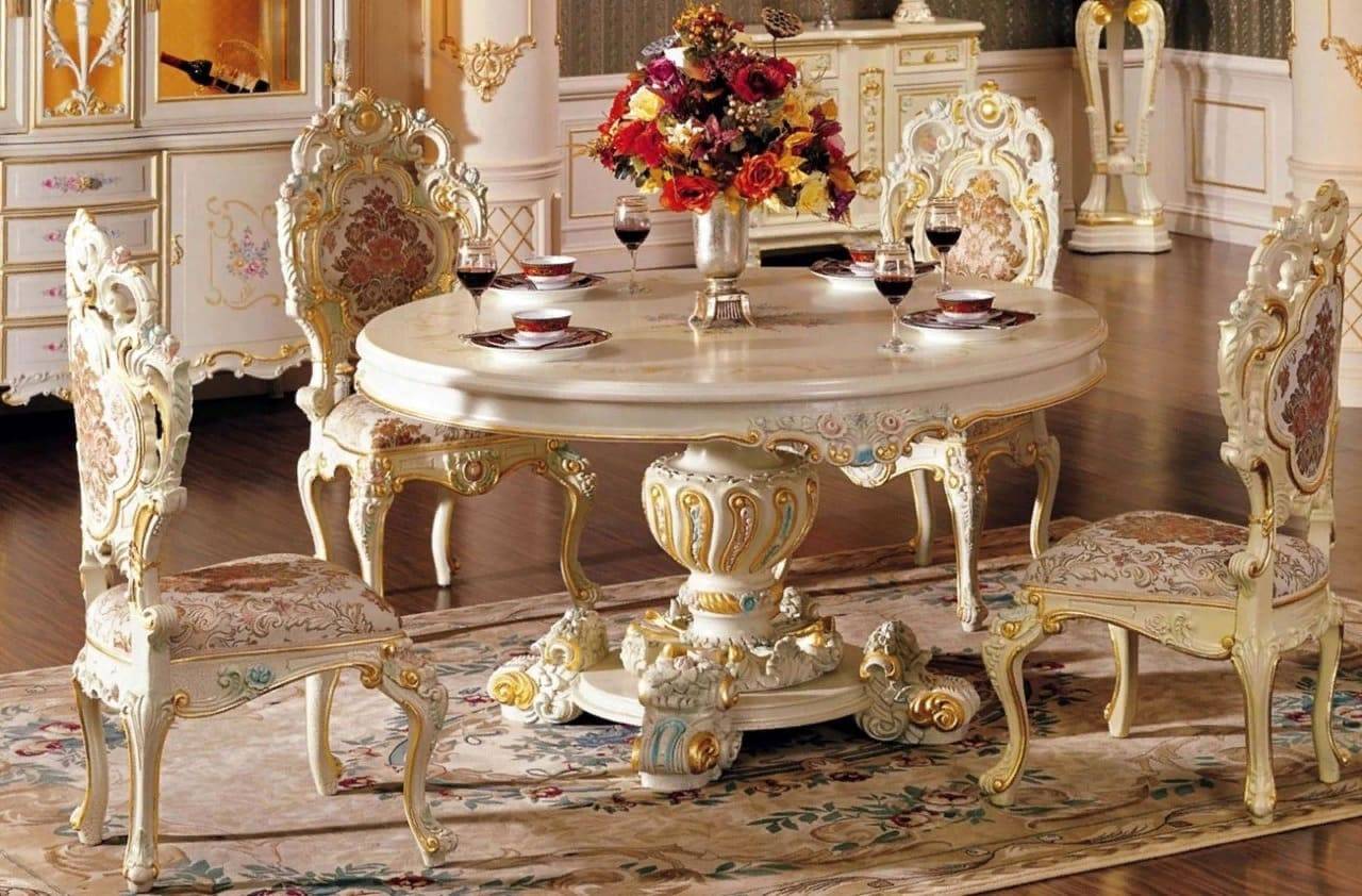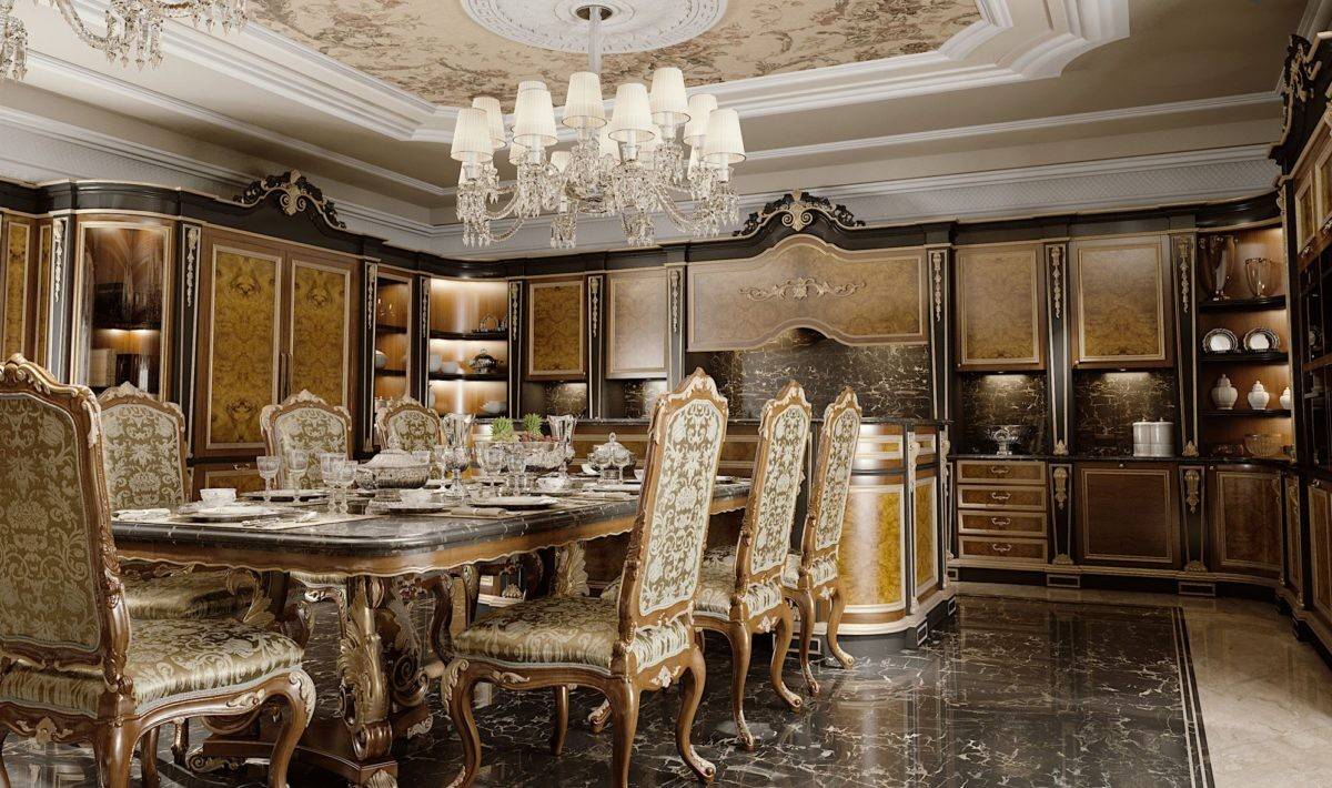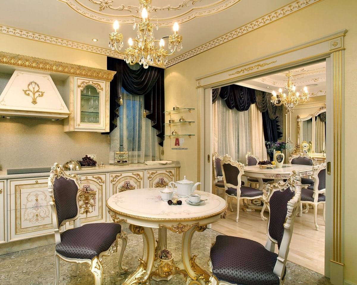 Мебельный гарнитур кухни в стиле барокко выполнен из дорогих пород дерева вроде каштана, дуба или ясеня. Разумеется, в ход идет фигурная резьба, позолота и вставки из полудрагоценных камней или слоновой кости. Приветствуются стеклянные дверцы полочек, выставляющие на показ дорогой фарфор. Массивный круглый стол в центре окружен изящными стульями с изогнутыми ножками и дорогой обивкой. Опять же, всё резное и позолоченное.