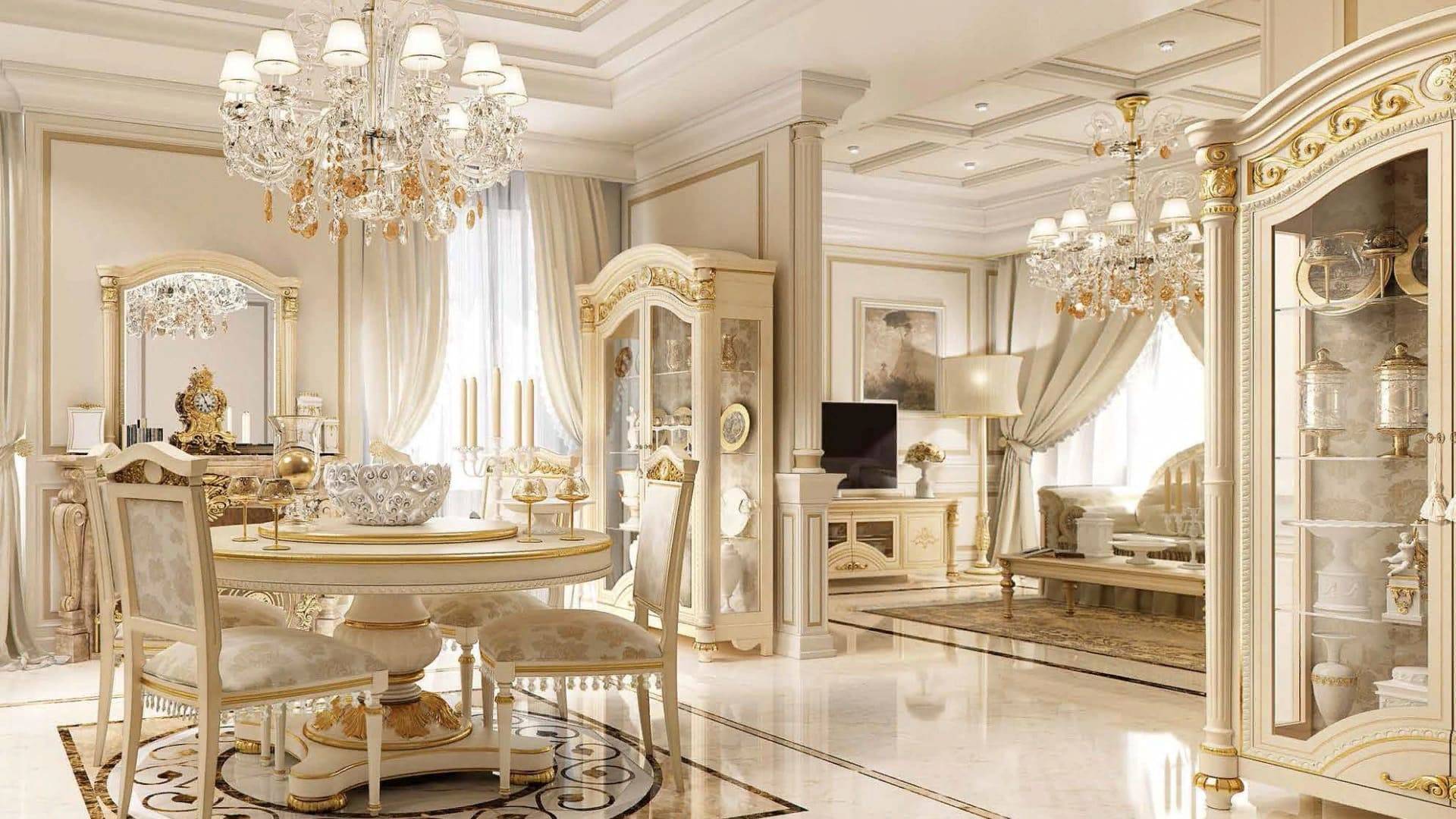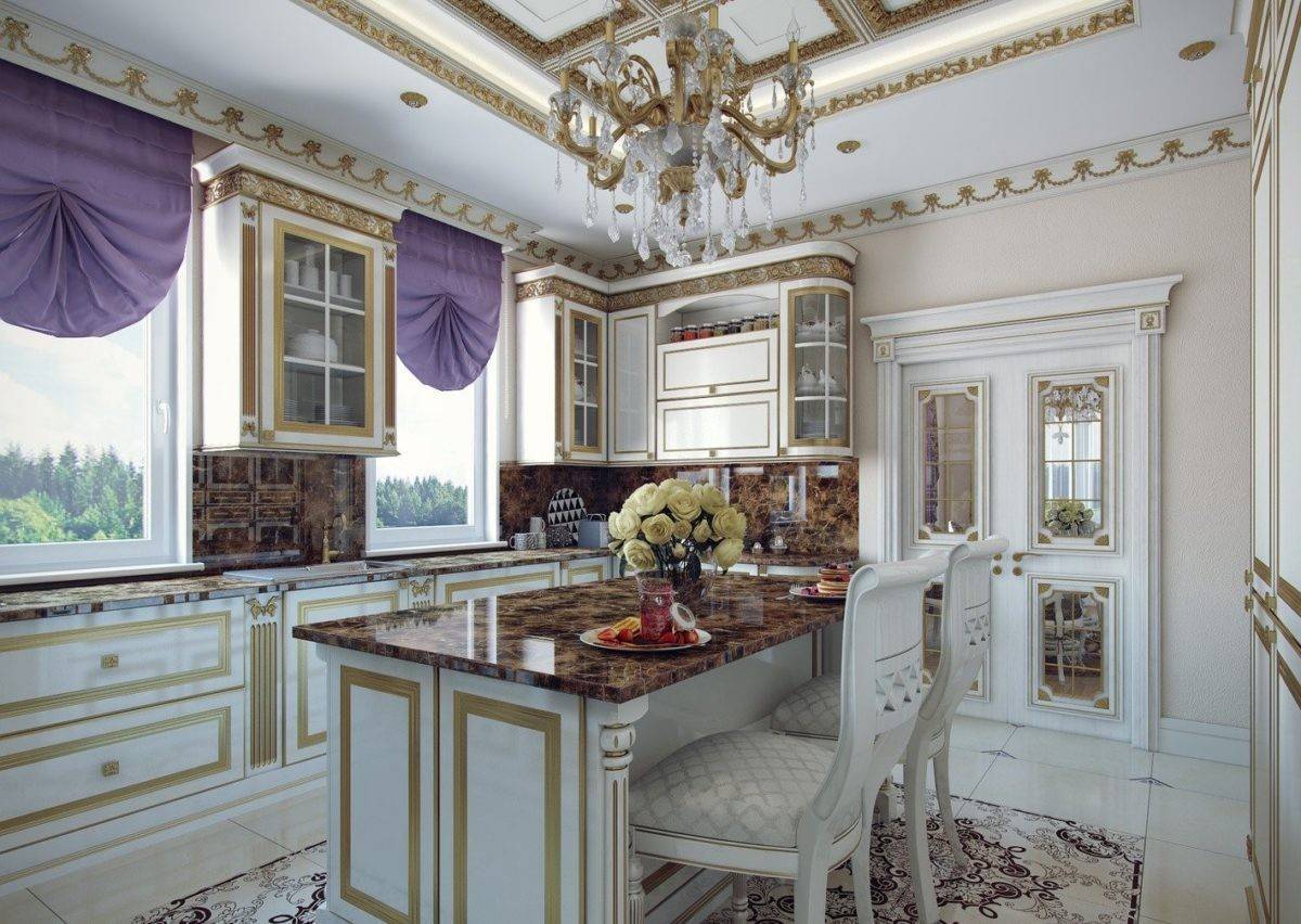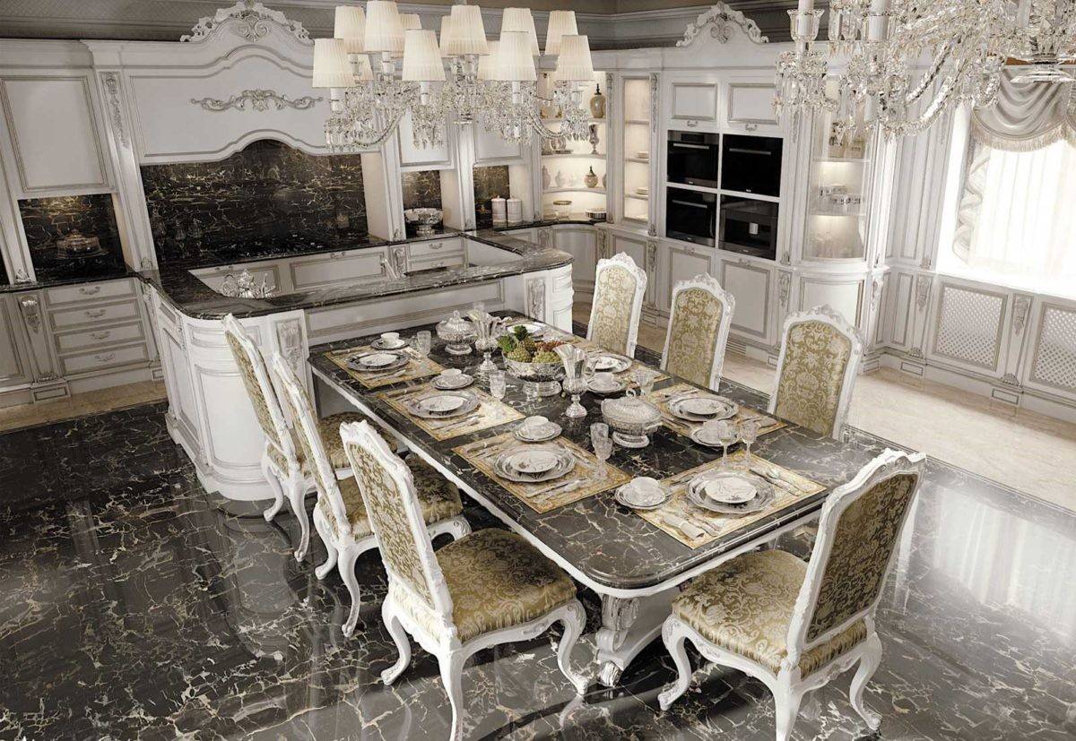 Мраморная столешница на ряду с аксессуарами вроде витых подсвечников, картин, хрустальной люстры и дорогим сервизом на обеденном столе поддержат атмосферу роскоши и излишества.