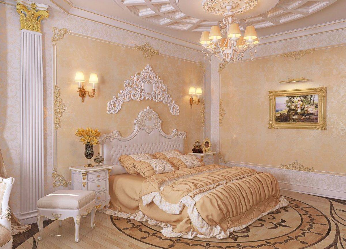 В спальном интерьер будет место мебели «времён Людовиков». Основным цветом рекомендуется выбирать любой, который расширит просторы. Пусть это будет «слоновая кость» с позолотой или молочный оттенок. Впрочем, всю спальню желательно оформить в тотально светлом настроении без включения контрастов.