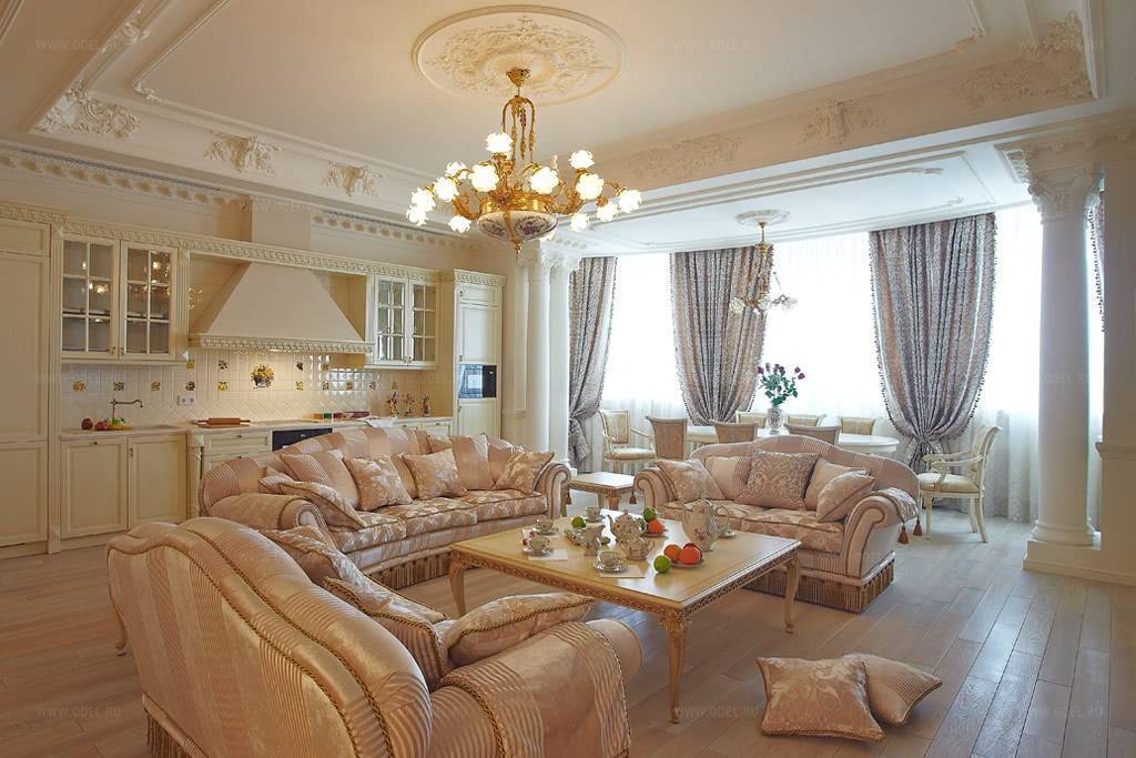 Поскольку колонны и лепнину на потолке в интерьерах современных жилых помещений реализовать удается не всегда, главный акцент в гостиной барокко переносится на мебель.