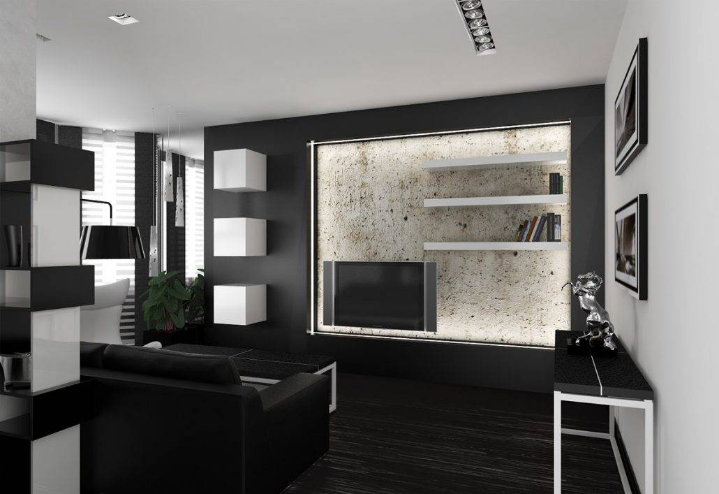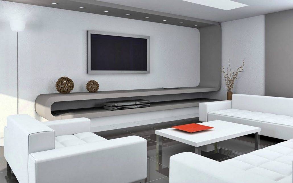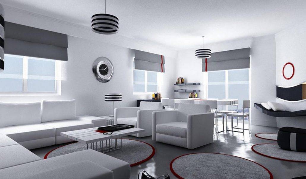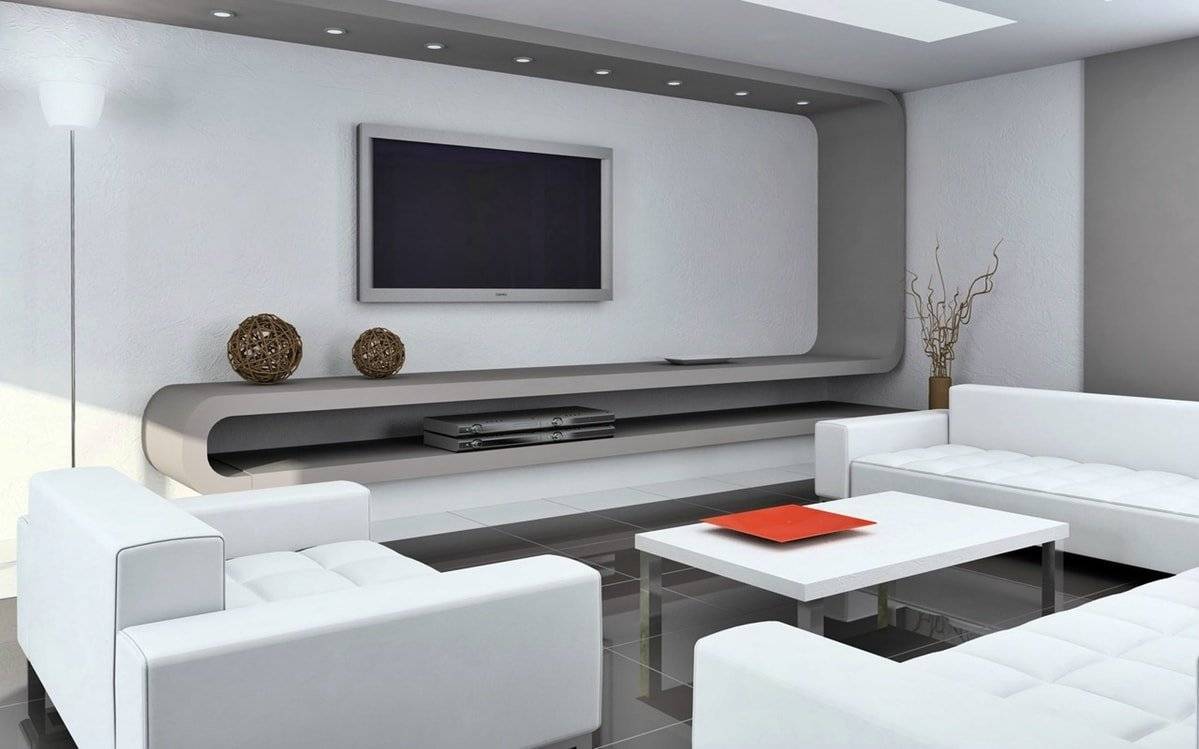 Гостиная. Мебели должно быть немного, а встроенная мебель имеет тот же оттенок, что и стены. В качестве напольного покрытия подойдет глянцевый ламинат, плитка, паркетная доска или линолеум. Для стен выбирают штукатурку или флизелиновые обои, которые со временем можно покрасить. Потолок — реечный, натяжной или подвесной, нередко с точечной подсветкой.