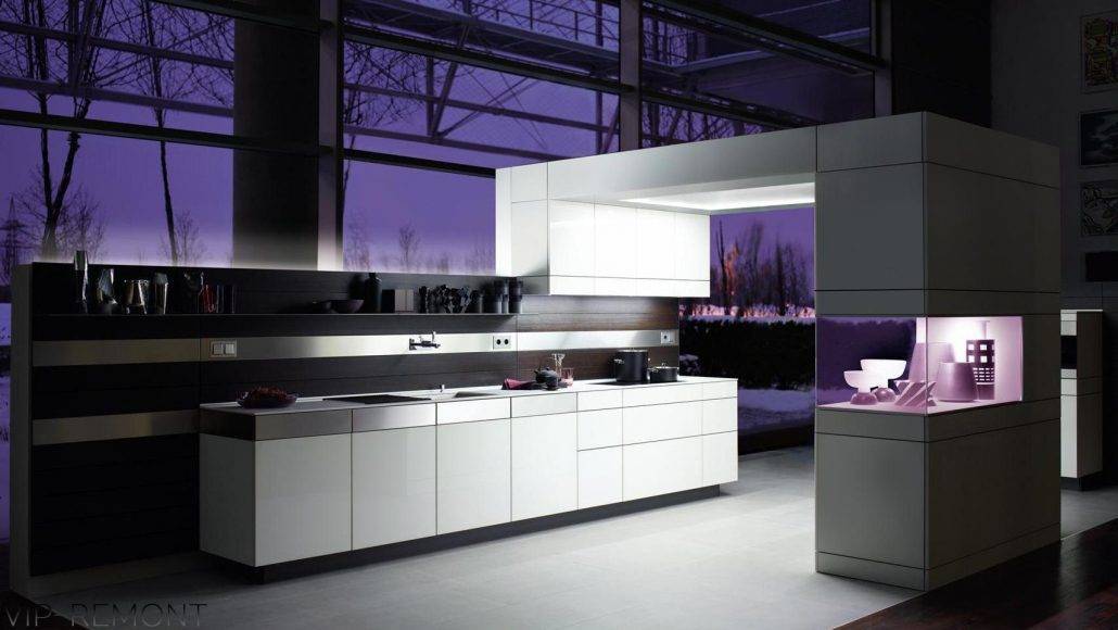 Кухня. Идеальное место для воссоздания оригинального дизайна. Стильная обстановка достигается использованием износостойких высокотехнологичных материалов; предпочтение отдается пластику, алюминию, стеклу, нержавеющей стали. Эталон стиля — комната со специальной модульной мебелью и со всей требуемой техникой; удачный ход — использование акцентной светодиодной подсветки.