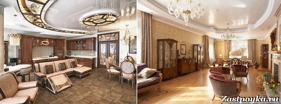 Потолочная люстра. Обязательно роскошная, габаритная. Наиболее подходящая модель — из кованых элементов с хрустальными подвесками. Популярны также витражные вариации в американском стиле. В современном представлении подойдут встроенные в потолок световые панели, украшенные витражным стеклом.