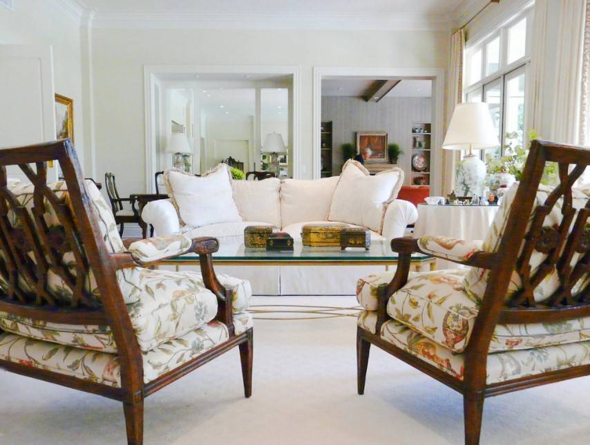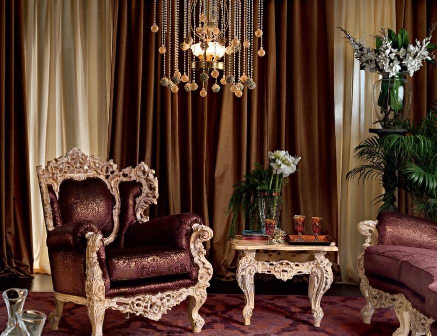 мебель всегда ажурна и нарядна; - тяжелые шторы из бархата, парчи или атласа будут уместны в обоих стилях.