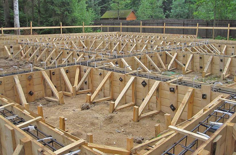 монтаж опалубки, которая выполняет функцию формы для заливки раствора (при устройстве фундаментов и других подземных конструкций предварительно выполняются земляные работы по рытью траншеи или котлована);