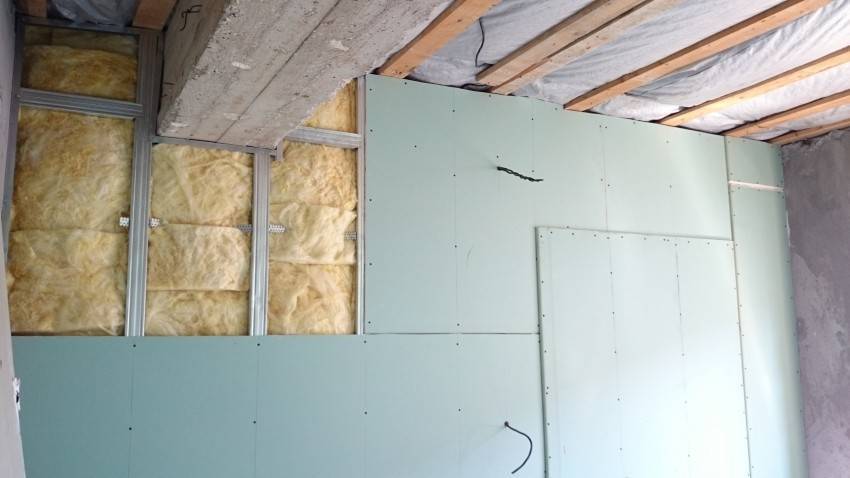 - На каркас из стандартных оцинкованных профилей, которые являются неотъемлемой частью гипсокартонных систем. Этот вариант отличается тем, что можно получить достаточно ровную поверхность без каких-либо усилий. Набор профилей, а также крепежа к ним, позволяет решить любую проблему, выровняв стены любой кривизны. Как правило, применение гипсокартонных систем позволяет получить между зашиваемой поверхностью и гипсокартоном промежутка. В этом промежутке размещаются различные коммуникации и электрическая проводка. Кроме этого, в подобный промежуток укладывается утеплитель, а также звукоизоляция. Если не заполнить этот промежуток, то гипсокартон прекрасно проводит звуки. Как правило, стараются решить сразу несколько проблем, в том числе и проблемы со звукоизоляцией за счет применяемого материала.