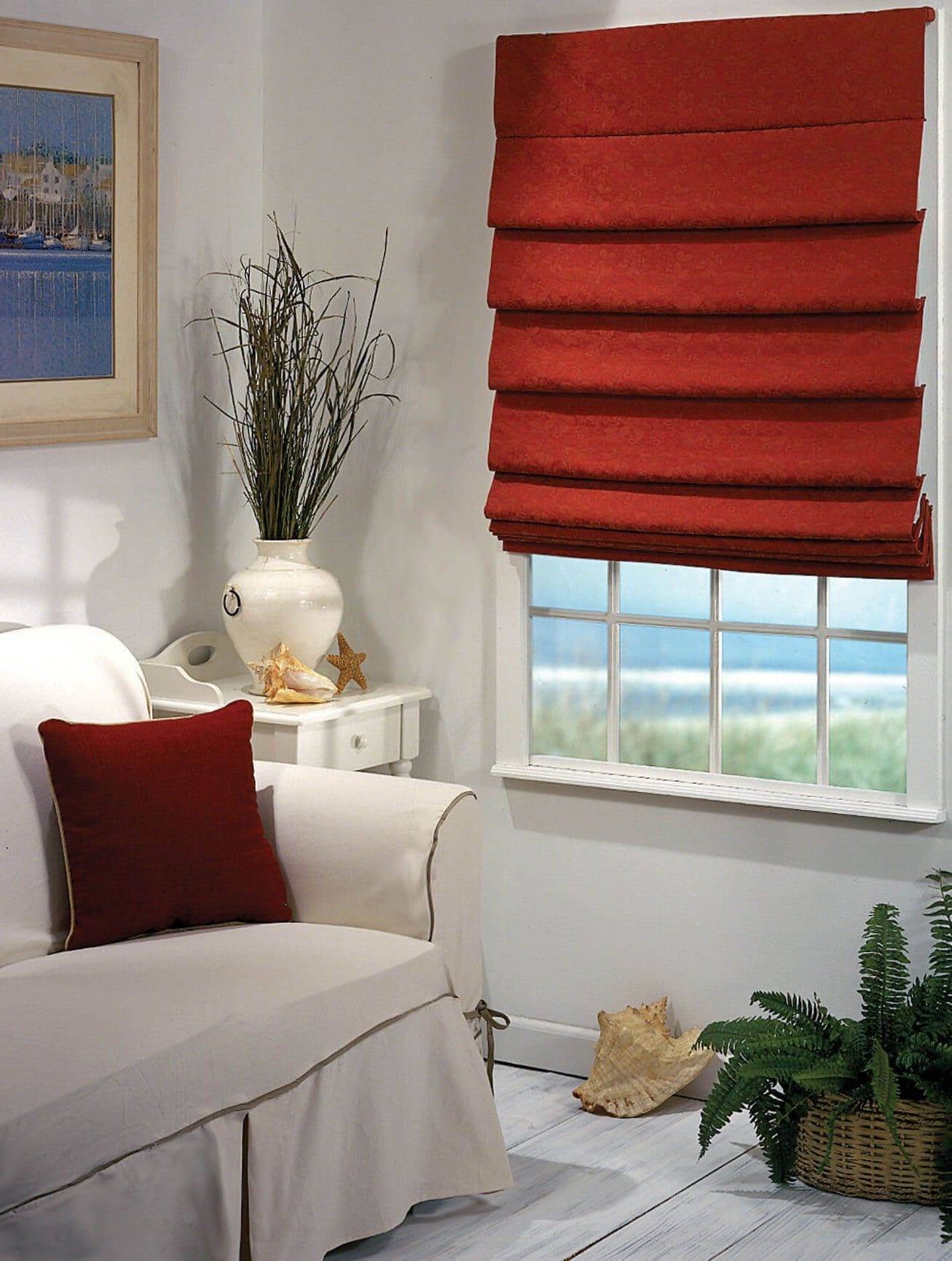 - римские – представляют собой отрез материи, полностью закрывающей проем, но имеют другой механизм управления. Если требуется открыть окно, то занавесь собирается наверх аккуратными горизонтальными складками;