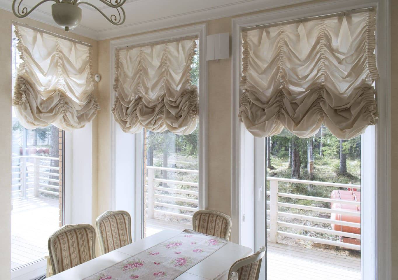- французские – изысканные занавески именуются по-другому “маркиза”. Выглядят очень торжественно и нарядно за счет формы: текстиль собран в множественные складки, которые ниспадают полукруглыми воланами;