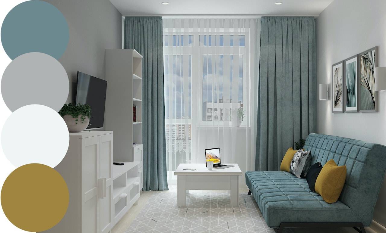 Этот цвет также имеет множество вариаций. Он может быть как насыщенным, так и едва ощутимым. Подойдут занавески морской волны, опаловых цветов, приглушенных.