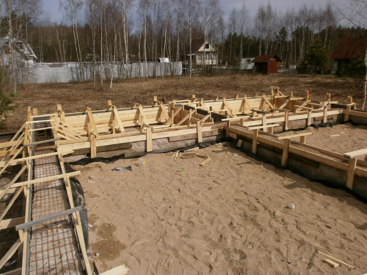 Этот вид фундамента определяет расположение несущих стен. Его изготавливают с помощью бетона: по предварительной разметке вырывают ямы, делают опалубку и заливают бетон. Для укрепления основания его армируют. После этого ждут полного высыхания фундамента и приступают к дальнейшим работам.