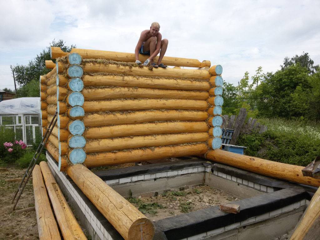 - Первый слой собирается из толстых бревен несколькими способами: «в торцевой шпунт, «в лапу» или «в чашу». Для крепления конструкции рекомендуется использовать металлические штыри и заполнять щели между бревнами межвенцовым утеплителем. После укладки трех венцов выполняется обработка древесины отработкой машинного масла или антисептиками.