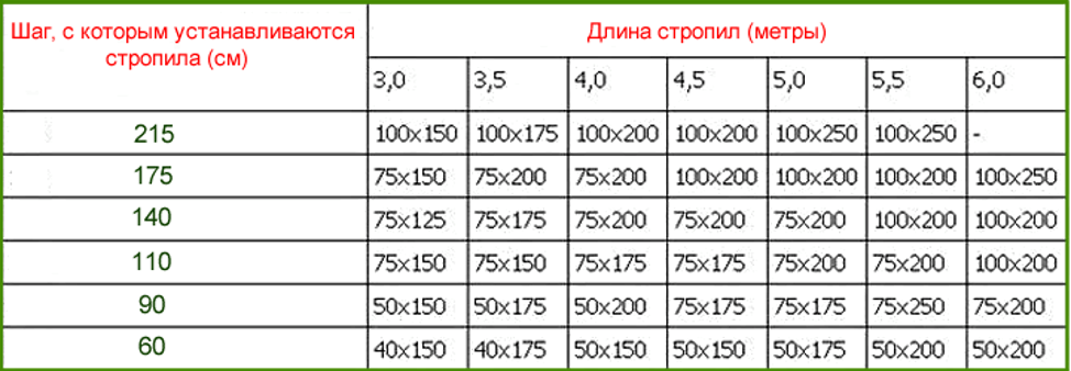 Таблица расчета длины стропил, шага между ними и сечения бруса.