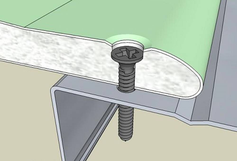 Обычно для крепления применяются специальные саморезы по гипсокартону, позволяющие надежно соединить профиль с поверхностью. Они имеют плоскую головку и ввинчиваются с помощью дюбелей.