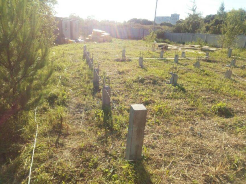 На этом этапе тоже придется следовать определенному порядку действий. Сначала делают разметку участка для свайного поля. В точках, где будут забиты сваи, в землю погружают прутки арматуры. Между ними натягивают бечевку и проверяют точность геометрии основания.
