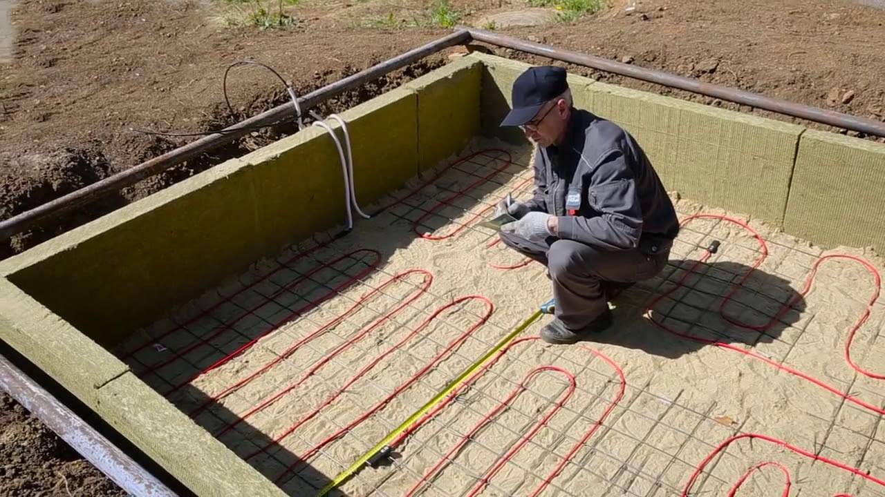 В качестве обогрева термосной теплицы используется электрический теплый пол. Выполняют армирование кабеля и заливают стяжку. Делается это для того, чтобы в процессе перекопки грядок избежать повреждения системы обогрева.