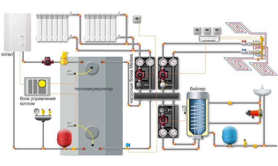 Совет! Чтобы функционирование схемы отопления было на высоте, теплоаккумулятор надо монтировать достаточно высоко, чтобы не было контакта с радиаторами отопления.