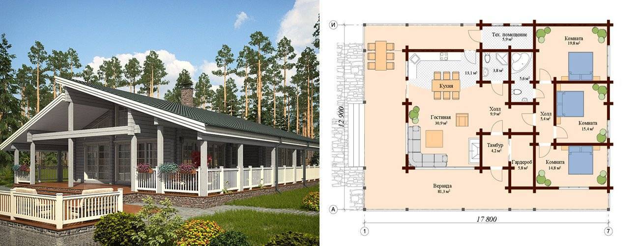 Одноэтажные дома из бруса 9×9 м²: актуальные проекты