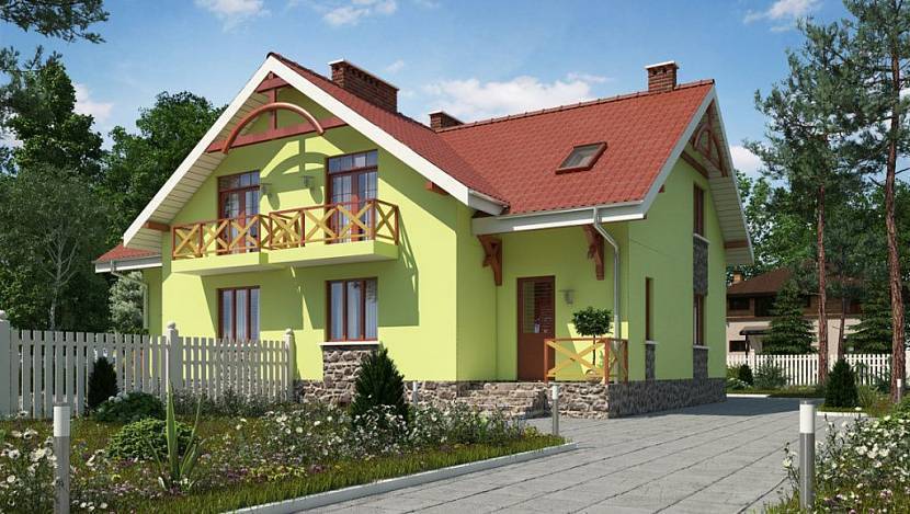 На первом этаже строения предусмотрена гостиная и столовая. Вверху можно сделать три комнаты и небольшой санузел. Гостиная выполняется в виде эркера, на кровле хорошо смотрится мансардное окно. Отличный проект для приятного отдыха и работы.