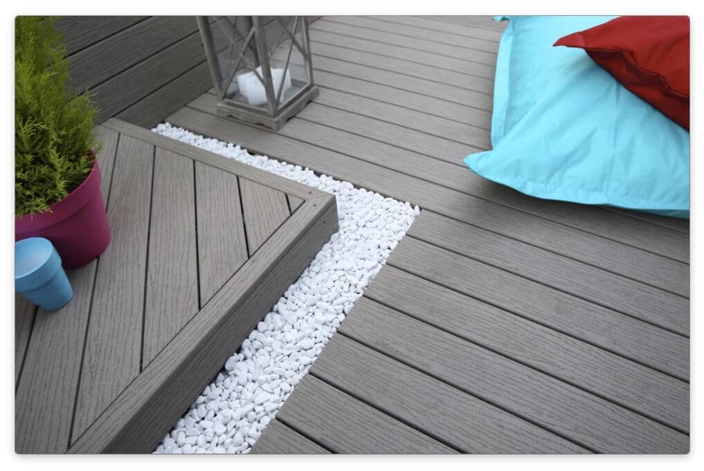 Как видно на фото укладки террасной доски из ДПК всегда бросаются в глаза компенсаторные зазоры, а именно продольные швы. Они делаются для того, чтобы с поверхности быстро стекала вода, а также за ней было удобно ухаживать. Это же можно сказать о том, что обеспечивается небольшое термическое сжатие/расширение в условиях температурных колебаний.