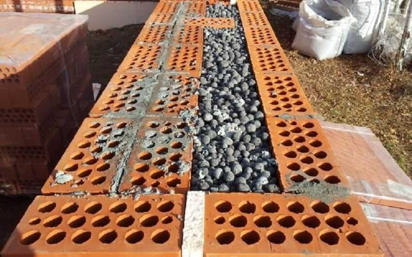 Пустотелые стены из кирпича имеют вид двух стенок толщиной в полкирпича, которые скрепляются вертикальными вкладками, имеющими такую же толщину, через каждые 70-100 см. Пространство между стенами заполняется с помощью шлаков или иных материалов, применяемых для утепления.