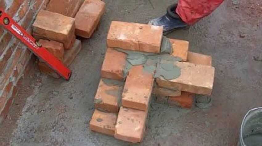 - Угол первоначально отстраивают в 4 ряда. Для формирования каркаса строения используют методику кладки вприжим. Растворная масса кладется на расстоянии примерно 1 см от наружного края кирпича. Растягивают смесь кельмой по поверхности, после кладут кирпич сверху, прижимая его к основанию. Рукояткой кельмы постукивают по материалу, горизонталь и вертикаль проверяют с помощью строительного уровня. В процессе раствор будет частично выдавливаться из швов, его используют для формирования новых.