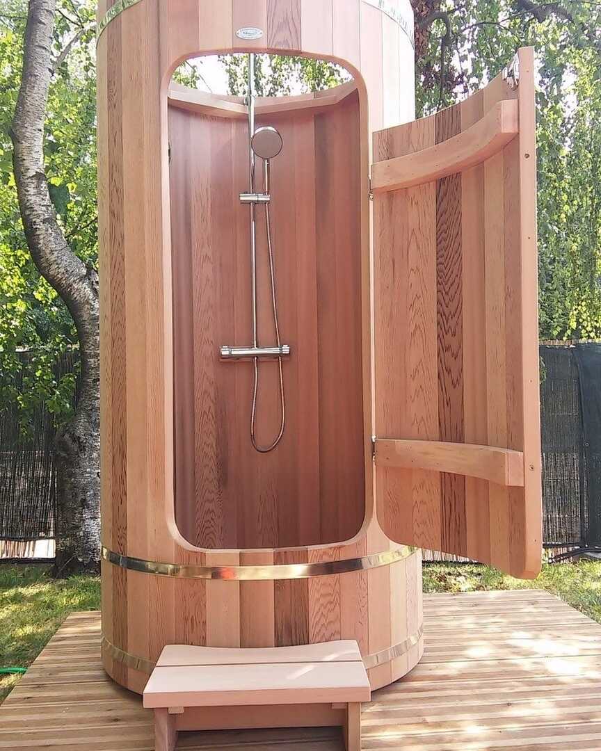 Здесь вы сможете принять полноценный душ, и точно будете защищены от сторонних взглядов. Материалами, как и в большинстве других вариантов, могут служить металлические листы в комбинации с деревом, просто дерево, бамбук и т.д.